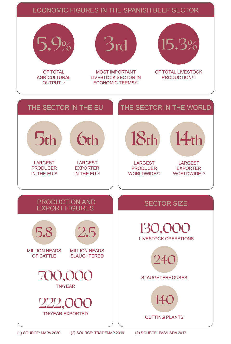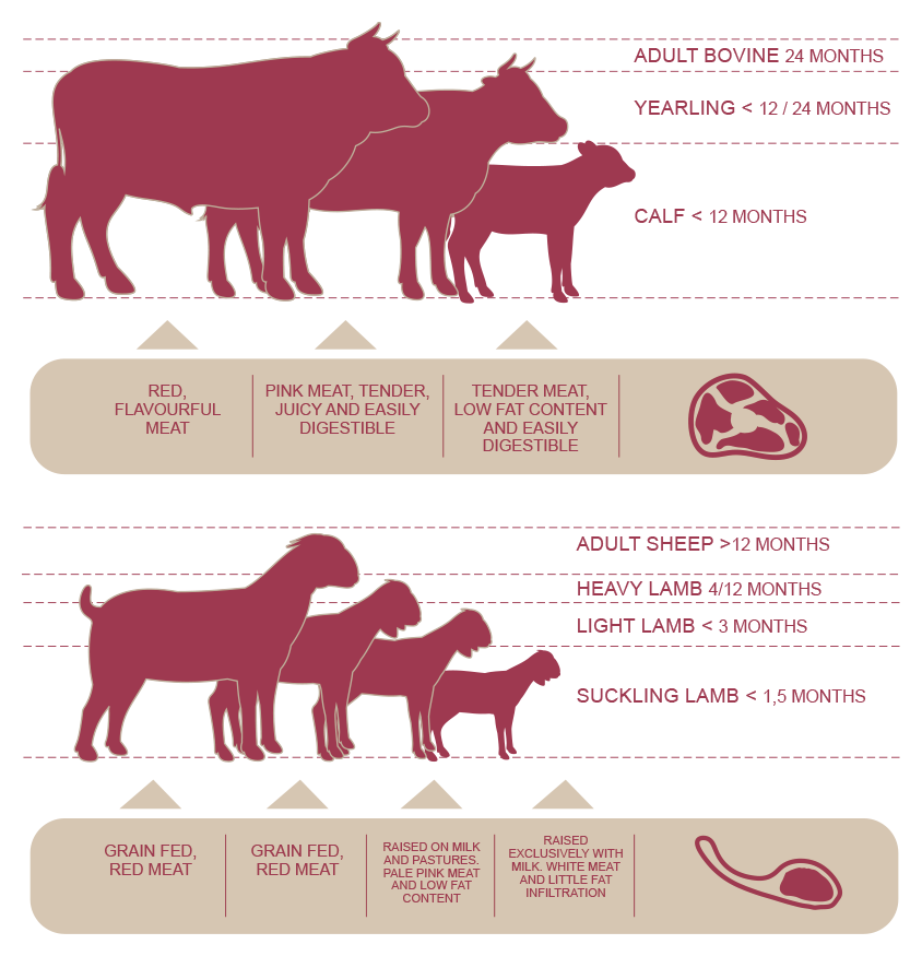 Compliance with the European Production Model, the diversity of breeds, the variety of meats depending on the age of slaughter, and in particular, the production and distribution of meat from young animals that have been fed on highly nutritional grains and oilseed give beef, lamb and goat from Spain their unique flavor and tenderness, for juicy, easily digestible, high quality meat.